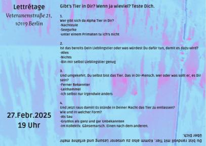 Am 27.02.2025 findet um 19 Uhr in der Lettrétage, Veteranenstraße 21, 10119 Berlin, die Lesung „Du willst das Tier im Text“